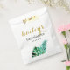Modern bachelorette weekend favour bag with pretty tropical palm leaves, and the bride to be's name in pretty gold colour hand lettered script.