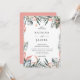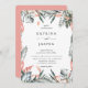 Modern tropics palm leaf frame, wedding invitation. Elegant painted tropical foliage in coral pink and silver greens, trendy typography design style with coral pink colour backing.