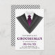 Invite your groomsmen with this modern request card featuring a classic tuxedo with a purple tie against a white background. Simply add your event details on this easy-to-use template to make it a one-of-a-kind invitation. Flip the card over to reveal a black and white stripes pattern on the back of the card.