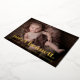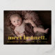 A modern photo baby birth announcement with bold type name in gold foil pressed type and landscape photo on the front. The back has 2 photos and family names. Click the edit button to customise this design.