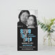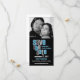 A save the date photo card for the couple that is not afraid of being different. Bold sans serif type in light blue and shades of grey stand out against the rich black background on this clean but effective card. Add your own information and photo. Available in alternate colours with matching products.