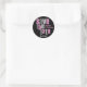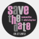 A save the date sticker for the couple who are not afraid of being different. Bold sans serif type in pink and shades of grey stand out against the rich black background on this clean but effective sticker. Add your names and event date. Perfect for envelope or package seals or use on favour bags. Available in alternate colours with matching products.