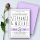 Modern black and white typography wedding bridal shower invitation accented with lavender purple. It showcases your text in black on white and the date of your wedding shower on a lavender banner. The back includes a pattern with white crosses on purple.