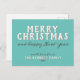 Modern Simple White Typography Merry Christmas and Happy New year Postcard. The design has a turquoise background and modern white and grey typography - you can customise all the text on the postcard.