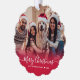 Modern Cute Minimalist 2 Photo Merry Christmas Script Holiday Ornament Card. This festive, simple minimalist, whimsical two photo holiday greeting card template features „Merry Christmas” greeting text which is written in a hand lettered swirly swash-tail font white calligraphy script red photo overlay. On the back side with your greeting message template with a little heart doodle and one photo template. Pretty greeting card for your family and friends in Christmas Holiday season.