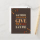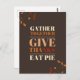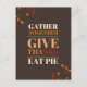 This modern Thanksgiving postcard features a bold and stylish typography design with the phrases "Gather Together, Give Thanks, Eat Pie" in warm autumn colours. The dark brown background and minimalistic accents of leaves and berries add a contemporary touch, making it perfect for sending festive holiday greetings with a fun and family-orientated message.