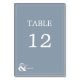 A modern and unique wedding table number including the name of the bride and groom in dusty blue. Personalise your own Dusty Blue wedding with this design and colour in our collection.