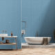 Modern vertical Niagara Blue striped pattern wallpaper suits any room, including the living room, bathroom, kitchen, bedroom, or nursery. The wallpaper shown is textured vinyl that can be easily peeled and stuck. It comes in a 2' x 12' sheet. You have the option to choose from different styles and sizes.
