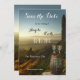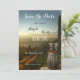 Save the Date card featuring two wine glasses with grapes on a barrel against a stunning landscape background. Beautiful for wine lovers or a planned event in a vineyard or winery.