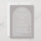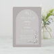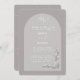 Modern Vintage Grey Arch Wedding Invitation. Vintage grey shades with arch. Script and serif fonts. White flowers and white text. Back has lines of light blue. Modern and minimalistic design. Personalise with your wedding details.