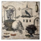 Modern vintage Halloween garden. Skulls, flowers in urns, raven in birdcage, spooky insects and skull collage art.
