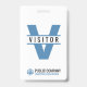 A modern visitor ID badge for your company, small business, school or hospital. The simple but elegant design shows the capital letter V with the word Visitor. It includes business name and logo, as well as a business tag line or slogan. This modern visitor ID badge can be easily adjusted to work as an ID badge for volunteers.