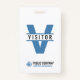 A modern visitor ID badge for your company, small business, school or hospital. The simple but elegant design shows the capital letter V with the word Visitor. It includes business name and logo, as well as a business tag line or slogan. This modern visitor ID badge can be easily adjusted to work as an ID badge for volunteers.