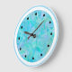 Modern stylish and trendy abstract wall decor clocks in beautiful shades of teal, blue, and green you can hang on the wall of your kitchen, bathroom or any room in your home or home office you want to add a touch of minimalist style.