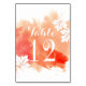 Modern abstract watercolor splash coral peach wedding table number place card featuring a hand painted watercolor paint splash with texture in tones of coral orange and peach, maple leaves in white with coral veins and text in white. This elegant and stylish casual wedding design is a completely customisable template perfect for your spring, summer or fall/autumn wedding. Note that this is only an image of watercolor and not real texture.