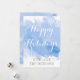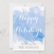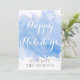 Modern abstract watercolor splash blue winter Happy Holidays Christmas flat card featuring a hand painted watercolor paint splash with texture in tones of blue, trees in white with snow , snowflakes, the text "Happy Holidays" in white and your name in grey.