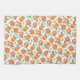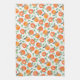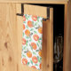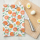 A sweet peach with green leaves pattern kitchen towel design set on a white background.