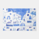 A blue and white watercolor painting of the village of Oia on the Greek island of Santorini.