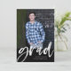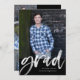 Graduation announcement with a big photo and modern script overlay. 3 photos on the back.