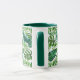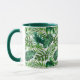 Contemporary mug design featuring watercolor monstera, banana and palm leaves illustrations on a striped background.