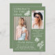 Modern Watercress Green White Butterfly Photo Graduation Party Invitations features the simple text "Congrats to the Grad" accented with a flower and butterflies with two of your favourite photos and personalised with name and graduation party details in elegant white script typography. Personalise by editing the text in the text boxes provided and adding your favourite photos. Designed by ©2023 Evco Studio www.zazzle.com/store/evcostudio