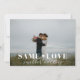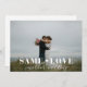 Custom-designed wedding downsize announcement card featuring "same love, smaller wedding" modern typography design on personalized wedding photo.
