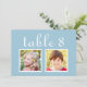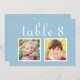 Modern and unique custom wedding table number cards feature childhood photos of the bride and groom at an age that corresponds with the table number. To customise: type in the table number, click "change" by the default photos to upload your own digital or scanned photos, and add that individual table number card to your shopping cart. Repeat for all of the table numbers that you need. White script custom text on a light blue (can be customised) background colour.