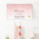 A simple and modern wedding banner. The background has an image of sparkling pink glitter drips along the top. The rest of the background is a delicate pastel pink colour gradient. 2 gold wedding bands across from the personalised text. A fancy classy divider line separates some of the text.