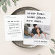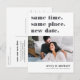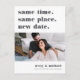 Need to change your wedding date? Notify guests with this modern and lighthearted postcard featuring the words "same time, same place, new date" in grey lettering. Customise with a photo and add your names along the bottom. Personalise the back with additional details, including your new date and a personal message.