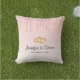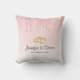 A simple and modern wedding pillow. The background has an image of sparkling pink dripping glitter along the top. The rest of the background is a delicate pastel pink colour gradient. 2 gold wedding bands above the personalised text.