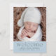 A simple modern birth announcement to share the news of your newborn baby. The blue card is perfect for your baby boy featuring a photo on the front and welcome in grey typography. Personalise with baby's name, birth date, birth stats and a personal message from Mum and Dad