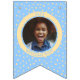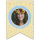 Replace the photos with your own for a fun party decoration and add your name and message. We have written "Welcome Baby" in a modern minimalist typography. It features soft boho colors of pastel yellow and blue and cute bohemian polka dots. It is also the perfect bunting for a nursery or a new baby party bunting flags.