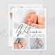 A simple and elegant budget-friendly birth announcement featuring a 3 photo collage of your newborn overlayed with "Welcome" in a stylish modern script. Add your baby's name, birth date and birth stats. On the back, add another photo and a personalised message.