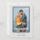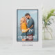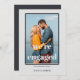 Modern photo engagement announcement card. The photo template is set up for you to add your picture, which is displayed in portrait format with an offset border and typography overlay. "we're engaged" is lettered in bold typography and the design has a colour palette of dark grey and silver grey. The remainder of the wording is fully editable for you to add your names and any additional information. A stylish, minimalist design to share your happy news whilst you organise a celebration or set the wedding date.