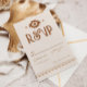 A modern western wedding RSVP card featuring warm neutral tones and bold southwest-inspired patterns. Perfect for ranch, desert, or outdoor weddings with a semi-formal western feel. Available as professionally printed invitations or a convenient digital file for easy sharing.