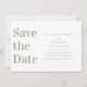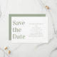 These save the date cards feature a modern and elegant sage green and white design. "Save the Date" is printed in a large font on the left side. The wedding or event information is printed on the right.