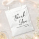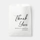 This elegant wedding thank you favour bag features black hand lettered calligraphy script with the words "Thank You" and your names and wedding date to personalise on a simple white background. Designed by Susan Coffey.