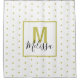 Modern White & Golden Circle Pattern Monogram Shower Curtain, for your modern home. Golden Circle Pattern on a black background with a beautiful monogram letter and name that you can change with your own name or business name.