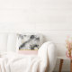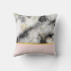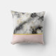 A pillow with an elegant and modern marbled pattern. White, black and smoky grey marble with thin ribbons of faux-gold swirls throughout the pattern. A light pink gradient background beneath the marbled pattern.