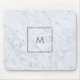 Custom-designed monogram mouse pad featuring modern white marble background design with personalised monogram enclosed in a silver glitter frame.