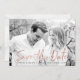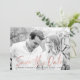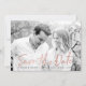 Modern save the date card featuring your horizontal engagement photo with "Save the Date" displayed in a handwritten faux rose gold script overlay. Personalise the front of the photo save the date with your names, wedding date, and wedding location. The card reverses to display an elegant white and grey marble design.