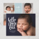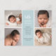 Modern birth announcement with one photo on the front and four on the back, accompanied by elegant white calligraphy script. All the colours can be customised. It can be personalised with your own message and baby stats.