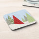 Triangle Christmas trees in snowy landscape modern art Christmas coasters.