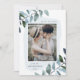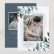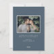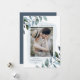 Elegant holiday photo cards featuring your favourite vertical photo framed by an icy light blue watercolor frame. Green and blue watercolor leaves & foliage adorn the edges of the unique Christmas card. Personalise the front of the card by adding a custom greeting (shown with "Merry Christmas"), your name, and the year in dark blue lettering. The card reverses to feature a solid dark blue background with a placeholder for an additional photo and your custom message displayed below in white text. The design coordinates with our Modern Winter Foliage Christmas card collection.