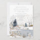 Beautiful modern invitations for a winter wedding featuring blue and mocha white watercolor winter scene of a lake, snow and trees in slate blue and tan on a snowy slope.