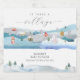 Cute adorable modern elegant winter baby shower theme, Holiday baby shower theme, design feature watercolor snow mountain winter Christmas village and script calligraphy typography "It takes a village" you can customize your own unique text and color.