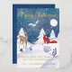 Customisable text design with whimsical nordic snowy winter night landscape with fir trees, deer, fox, bullfinch, and snow owl.