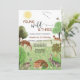 Gender-neutral modern and colourful woodland 3rd Birthday party design "Young wild and Three" in an elegant font with cute baby fox, rabbit, hedgehog, and other woodland animals and birds in a meadow with trees.