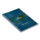 A modern school-or-office blue-notebook, personalised with your own name (or company, brand...), initials and custom lines of text (special subject)... and with a greenish map of the world