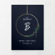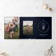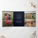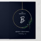A modern Christmas holiday photo tri-fold card featuring a single initial family monogram, multiple landscape and portrait photo apertures with a gold wire wreath and asymmetrical holiday swag with pine branches, cypress and berries on a dark navy blue background. A great way to showcase family photos and a special personalized holiday message.